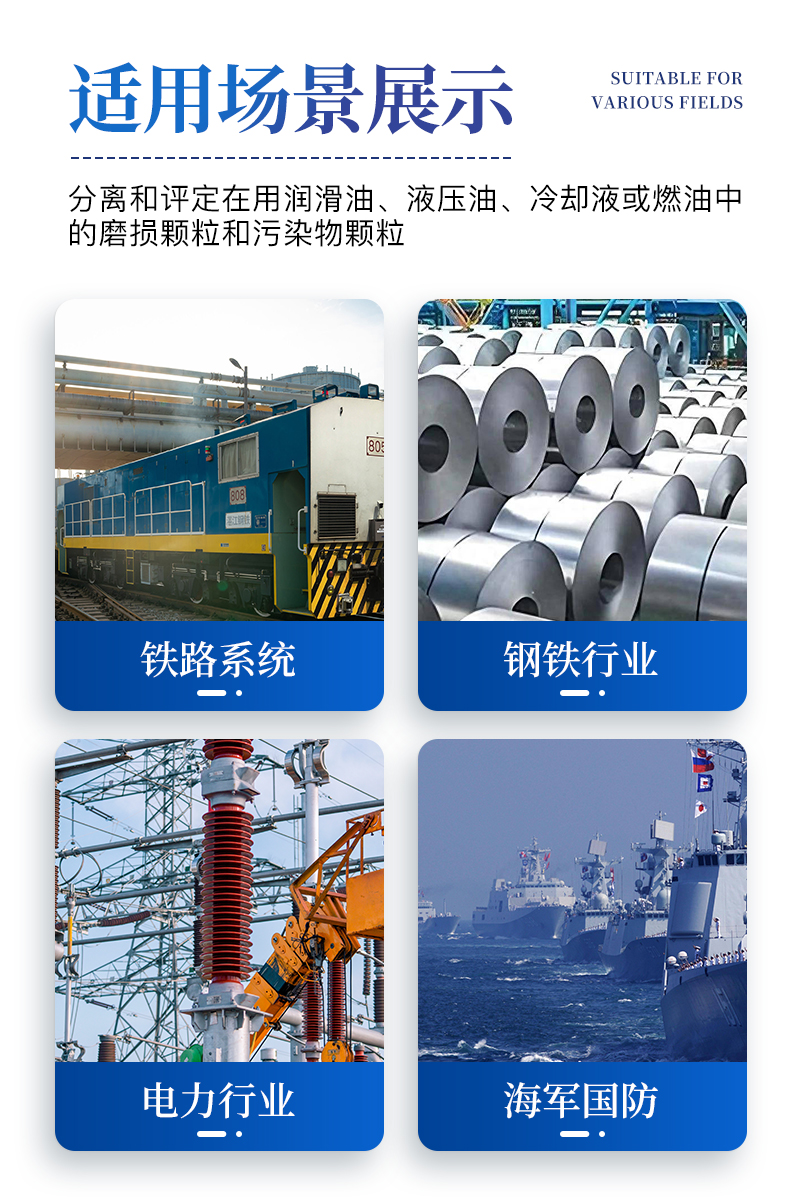 ?。?4)應用范圍:用以分離和評定在用潤滑油、液壓油、冷卻液或燃油中的磨損顆粒和污染物顆粒;