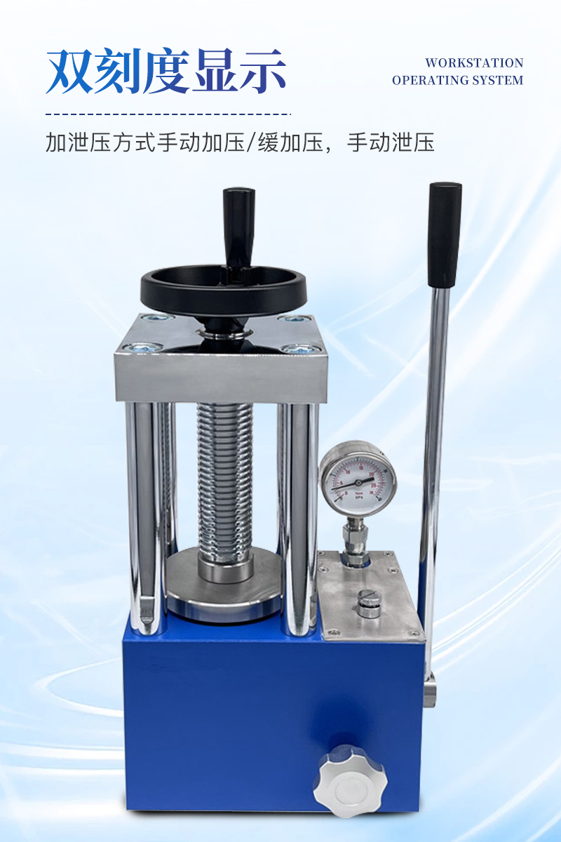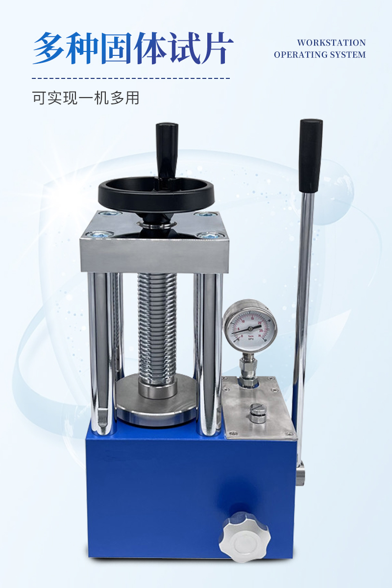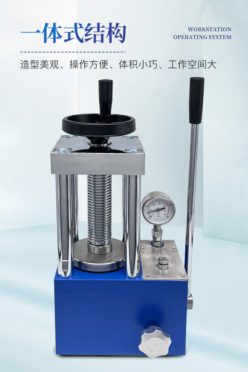 手動壓片機該機采用一體式結構,手動液壓驅動,兩立柱設計,具有造型美觀、操作方便、體積小巧、工作空間大等優點,非常適合拖進手套箱內使用;配上特定模具,可對各種粉末材料壓制成型,廣泛應用于科研、教學、檢測、催化、制藥等各個領域。