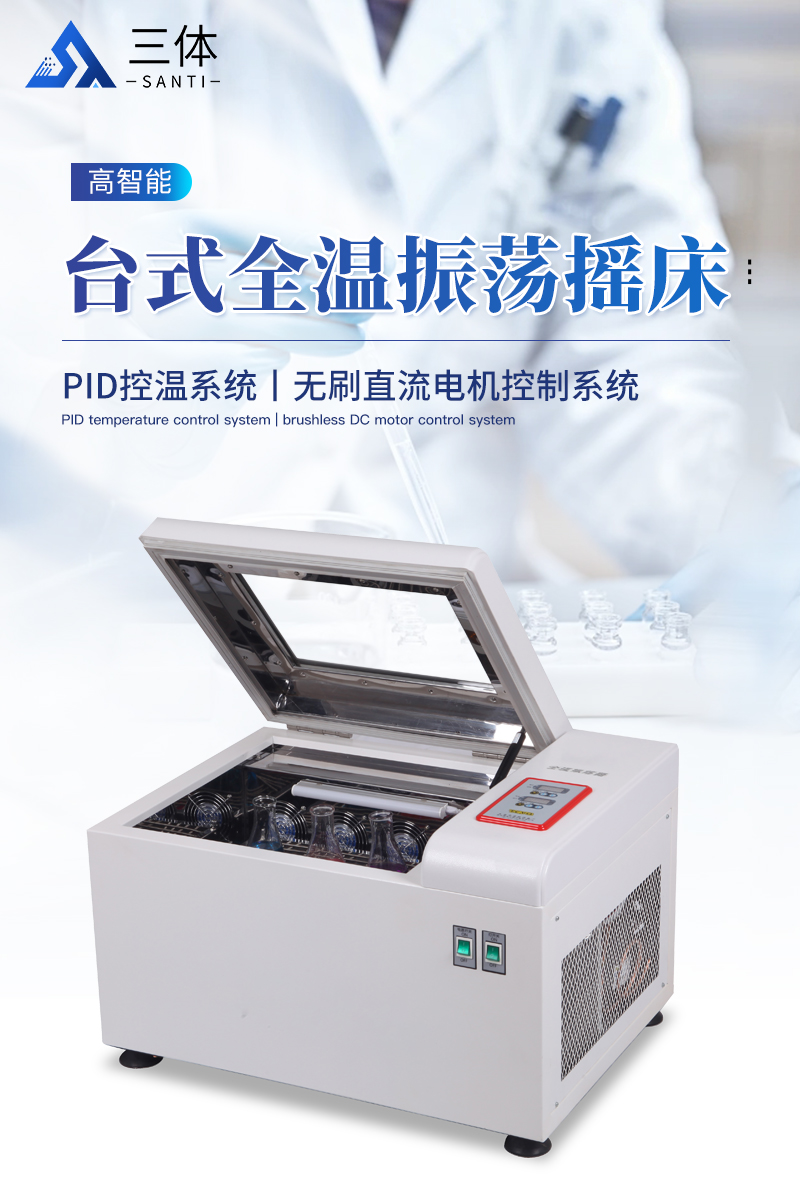臺式恒溫小型振蕩器專為需求用地面積小的用戶設計。具有小外形體積,大工作空間的特性。可以放置在堅固的臺面或地面。該型搖床裝備PID控溫系統和無刷直流電機控制系統,可滿足對溫度和速度有較高要求的用戶需求。