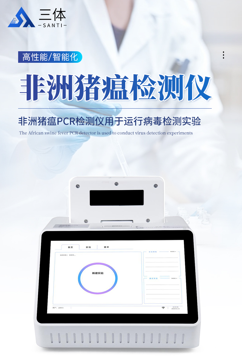 非洲豬瘟PCR檢測儀(實時熒光定量PCR儀支持變溫檢測)用于運行病毒檢測實驗,并對實驗數據進行分析;儀器既可在實驗室內操作,又可用于野外科學實驗,配合相應試劑,對取自待檢測樣本的分析物或其他分析物中的目標核酸進行快速、準確的定性檢測。