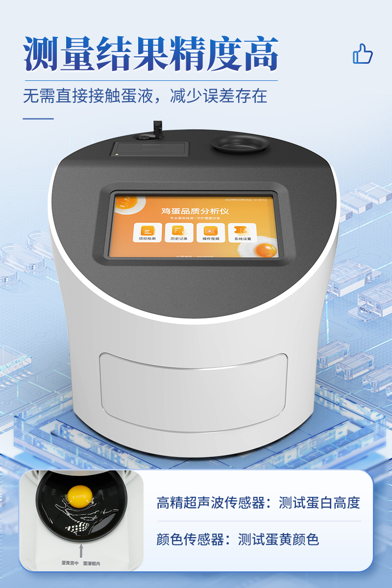 4.創新采用高精超聲波傳感器測試蛋白高度,精密傳感器測試蛋黃顏色,無需直接接觸蛋液,減少誤差存在。