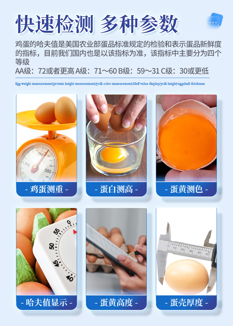 雞蛋品質(zhì)分析儀技術指標:雞蛋測重,蛋白測高,蛋黃測色,哈夫值顯示,蛋黃高度,蛋殼厚度等,可進行雞蛋等級計算。雞蛋的哈夫值是美國農(nóng)業(yè)部蛋品標準規(guī)定的檢驗和表示蛋品新鮮度的指標,目前我們國內(nèi)也是以該指標為準,該指標中主要分為四個等級,AA級:72或者更高;A級:71~60;B級:59~31;C級:30或更低。