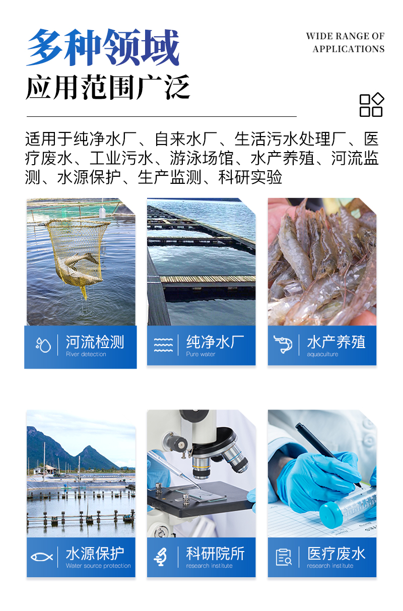 適用于純凈水廠、自來水廠、生活污水處理廠、**廢水、工業污水、游泳場館、水產養殖、河流監測、水源保護、生產監測、科研實驗等。