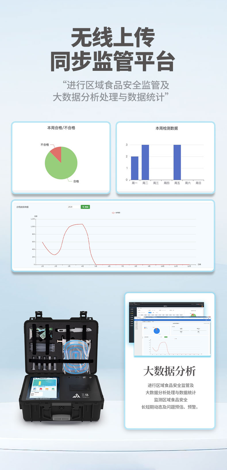 11、儀器具有 wifi 聯(lián)網(wǎng)上傳、RJ45網(wǎng)線連接功能,可以快速上傳數(shù)據(jù)。同步對接監(jiān)管平臺,數(shù)據(jù)可局域網(wǎng)和互聯(lián)網(wǎng)數(shù)據(jù)上傳,檢測結(jié)果直接傳至食品安全監(jiān)管平臺。進(jìn)行區(qū)域食品安全監(jiān)管及大數(shù)據(jù)分析處理與數(shù)據(jù)統(tǒng)計,檢測區(qū)域食品安全長短期動態(tài),達(dá)到食品安全問題預(yù)估、預(yù)警。