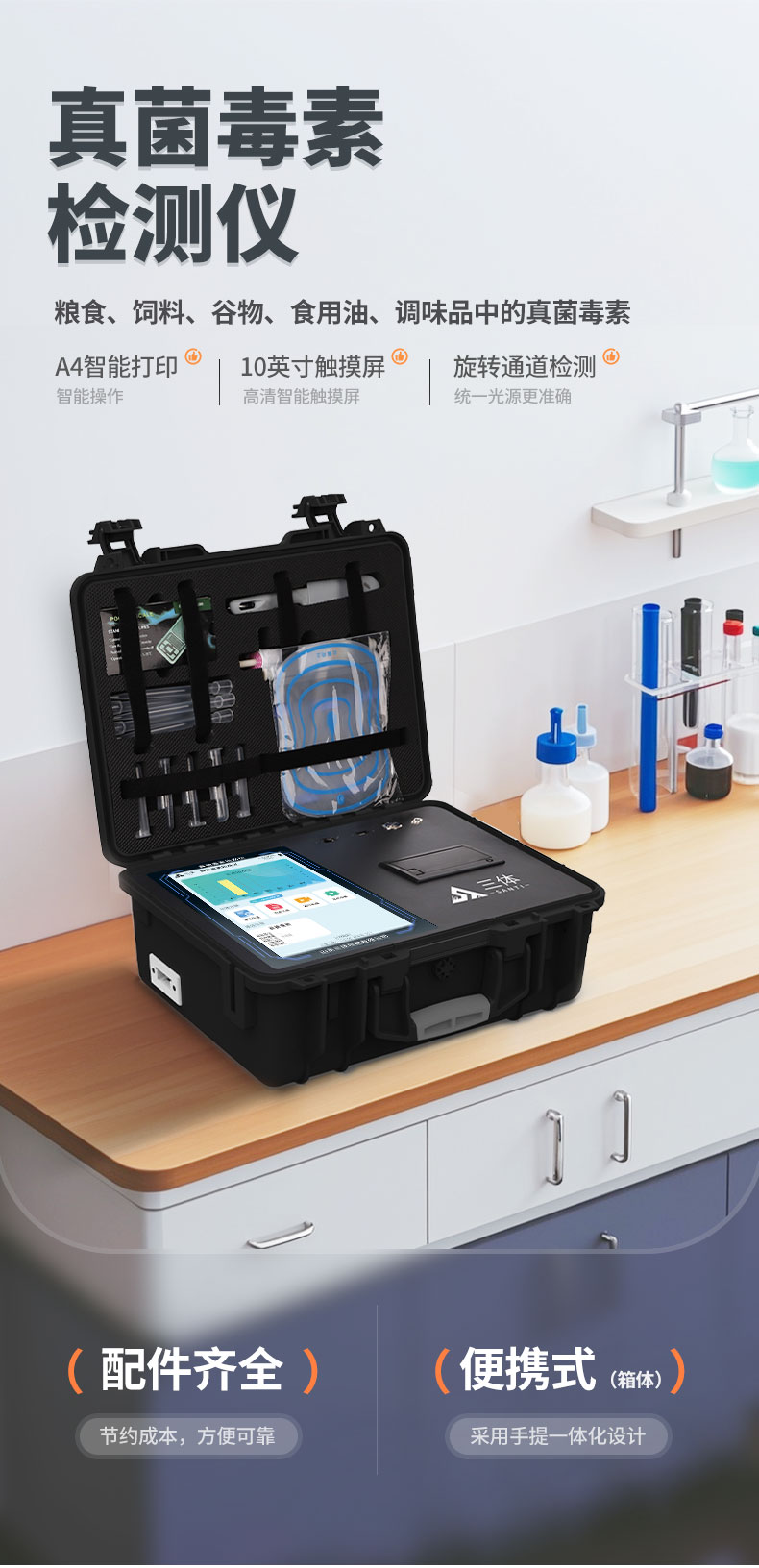 3、一體化便攜式快檢設(shè)備,采用交直流兩用供電方式,可連接車載電源,配備6ah大容量充電鋰電池,可以滿足現(xiàn)場及流動檢測使用的需求。儀器尺寸:43×35×20cm,   主機(jī)凈重:5.1kg