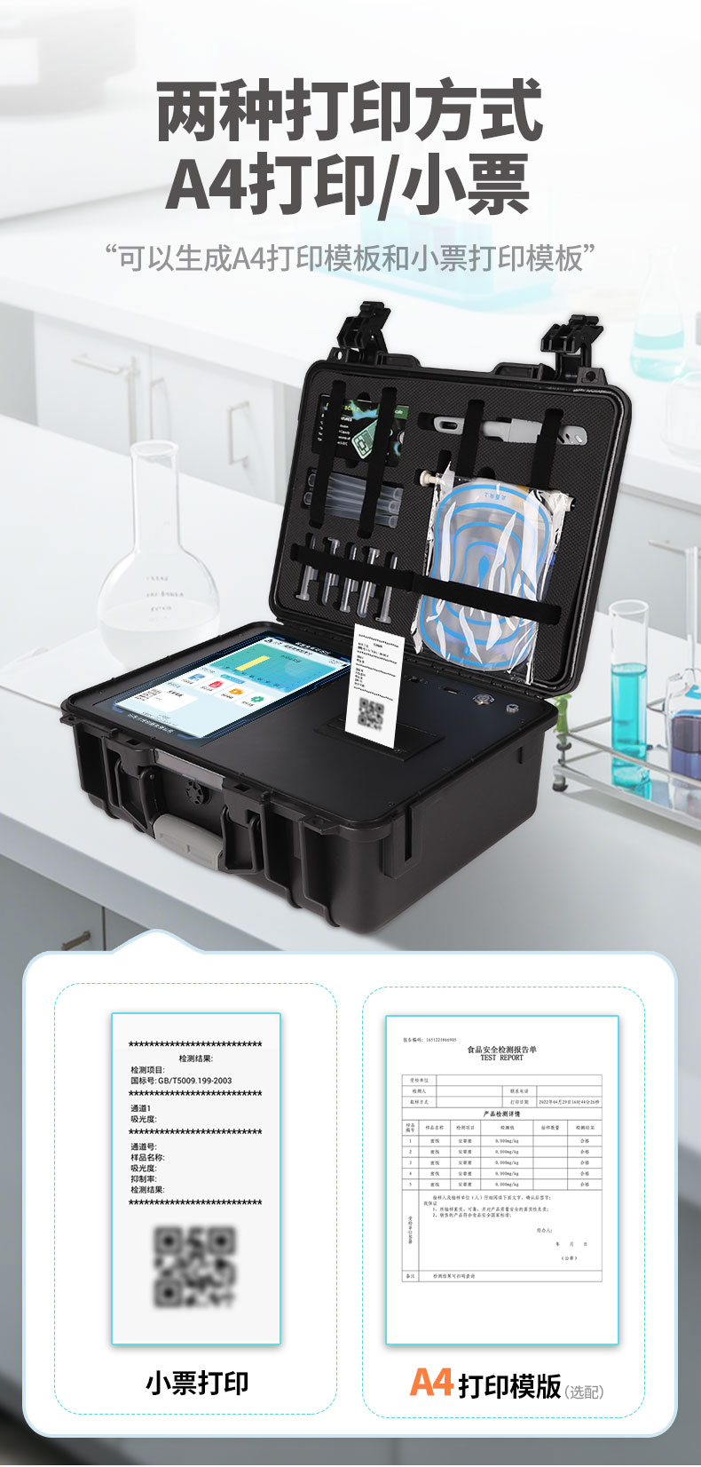10、A4紙版本報告打印功能:設(shè)備擁有兩種結(jié)果展示方式,可以自動生成A4打印模板和小票打印模板兩種樣式,可通過WiFi及網(wǎng)線等方式鏈接外置打印機(jī)可進(jìn)行打印
